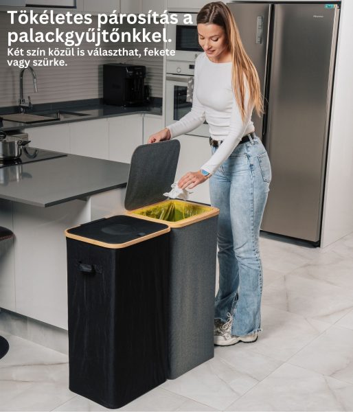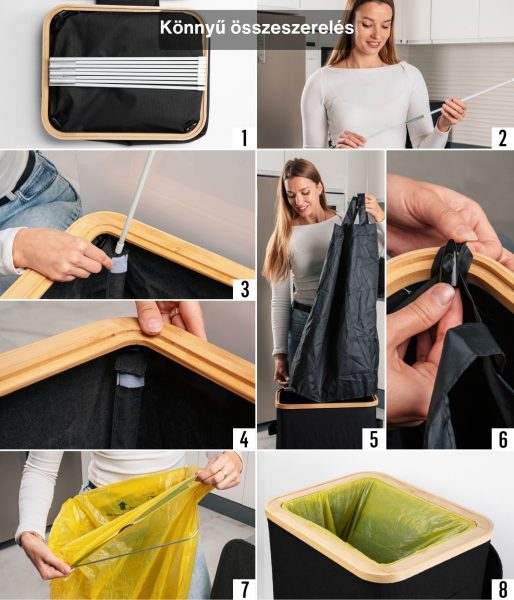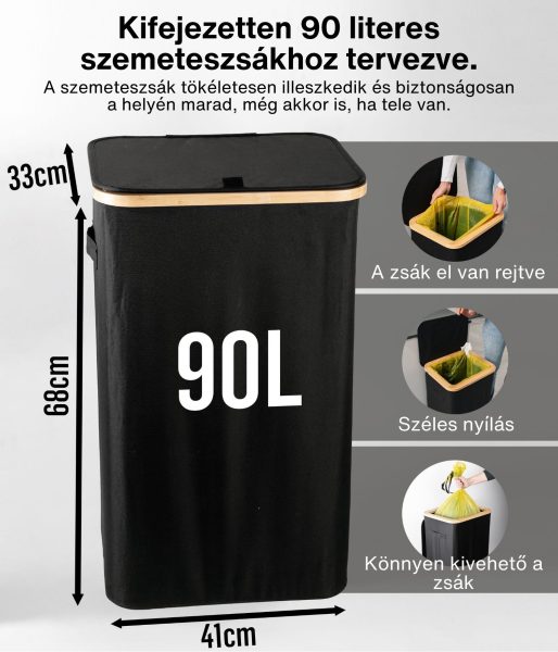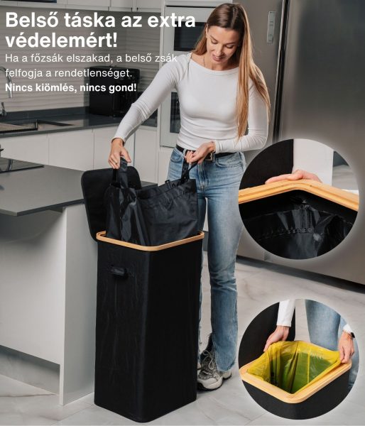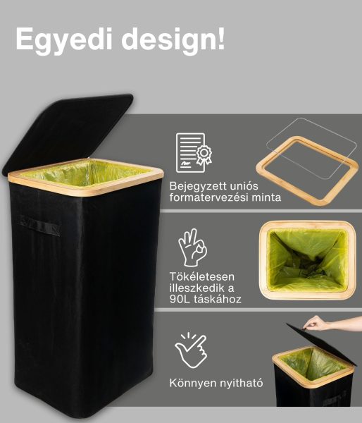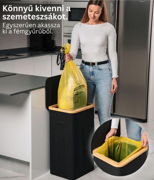 Ez a modell megerősített varrásokkal, tartós anyagokkal és esztétikusan kifinomult fekete színnel büszkélkedhet, amely zökkenőmentesen illeszkedik bármilyen térbe – legyen az egy modern iroda vagy egy minimalista konyha. Kompakt, mégis tágas kialakítása lehetővé teszi a hatékony újrahasznosítást anélkül, hogy túl sok helyet foglalna. Emellett a szemeteskosár bambuszkerettel rendelkezik, amelyen egy vasgyűrű található, amelyhez a szemeteszsákot rögzítik, így könnyen cserélhető és használható. A kukát 90 literes szemeteszsákokhoz tervezték, de könnyedén használhat nagyobbakat is.