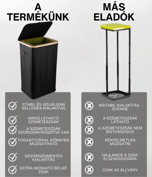 INNOVATÍV TERVEZÉS: Szabadalmaztatott bambuszkeretünk fémgyűrűvel biztonságosan a helyén tartja a szemeteszsákot és megakadályozza, hogy megereszkedjen. A szövetfedél diszkréten elrejti a hulladékot és segít távol tartani a szagokat.